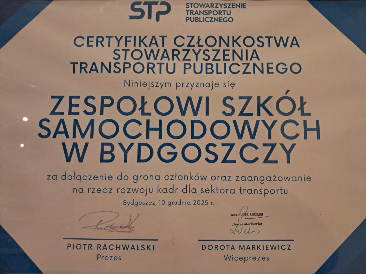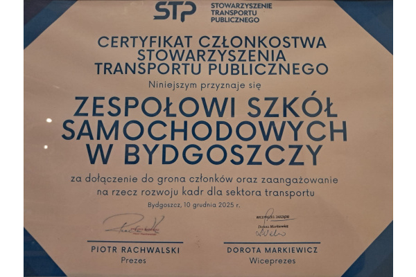 Ważnym punktem konferencji było przyjęcie Zespołu Szkół Samochodowych do Stowarzyszenia Transportu Publicznego. Certyfikat członkostwa na ręce dyrektora Zespołu Szkół Samochodowych Janusza TOMASA przekazała wiceprezes zarządu Dorota MARKIEWICZ.